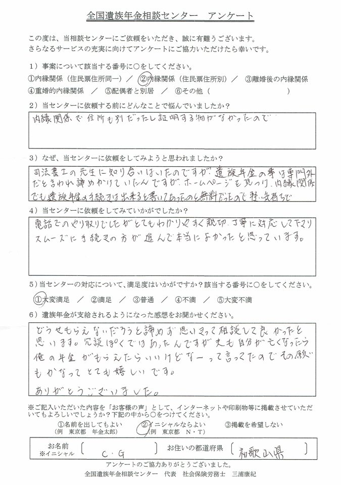 内縁の妻でも請求できることを知り年金事務所の窓口相談に行きましたが対応は「ムリ」の一点ばりで、あきらめかけていたところ、三浦先生のことを知り連絡させていただきました。