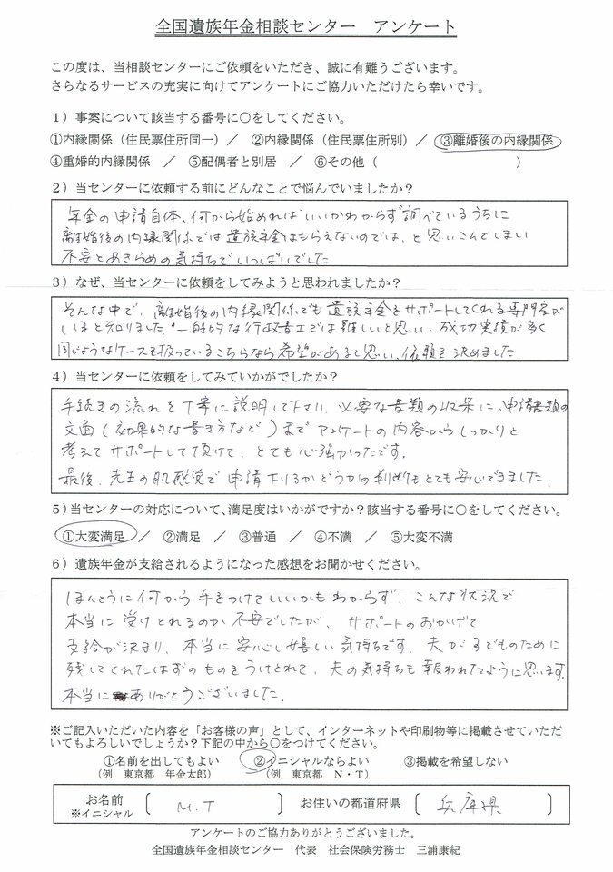 離婚後に復縁し内縁関係のままでしたが、今後のことも考え再度入籍をしようかと話していた矢先に、主人が急死し、受給資格はないものとあきらめていたので、決定通知が届いた時は本当に嬉しかったです。ありがとうございました。