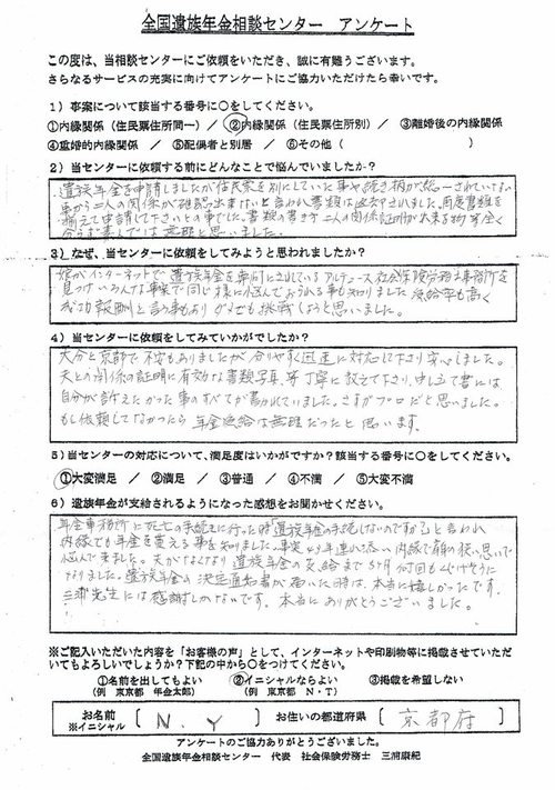 御社にお願いしたからこそ遺族年金を受給できる事になったと思います。本当にありがとうございました。